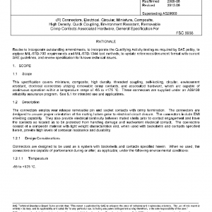 This specification covers miniature, composite, high density, threaded coupling, self-locking, circular, environment resistant, electrical connectors utilizing removable crimp contacts, and associated hardware, which are capable of continuous operation within a temperature range of −65 to +175 °C. These connectors are supplied under an AS9100 reliability assurance program. See 6.1 for intended use and applications.