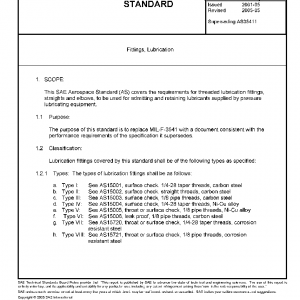 This SAE Aerospace Standard (AS) covers the requirements for threaded lubrication fittings, straights and elbows, to be used for admitting and retaining lubricants supplied by pressure lubricating equipment.