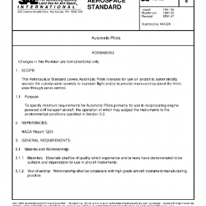 This Aeronautical Standard covers Automatic Pilots intended for use on aircraft to automatically operate the aerodynamic controls to maintain flight and/or to provide maneuvering about the three axes through servo control.