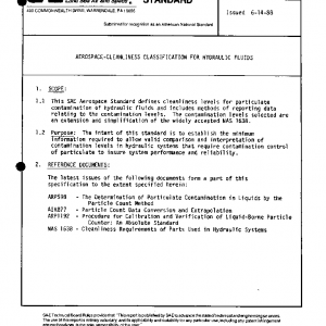 This SAE Aerospace Standard defines cleanliness levels for particulate contamination of hydraulic fluids and includes methods of reporting data relating to the contamination levels. The contamination levels selected are an extension and simplification of the widely accepted NAS 1638.