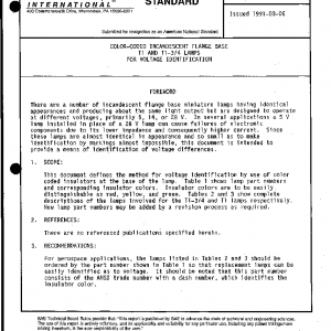 This document defines the method for voltage identification by use of color coded insulators at the base of the lamp. Table 1 shows lamp part numbers and corresponding insulator colors. Insulator colors are to be easily distinguishable as red, yellow, and green. Tables 2 and 3 show complete descriptions of the lamps involved for the T1-3/4 and T1 lamps respectively. New lamp part numbers may be added by a revision process as required.