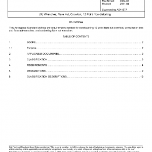 This SAE Aerospace Standard (AS) covers 12 point flare nut crowfoot, flare nut wrenches, double end flare nut wrenches, combination box and flare nut wrenches, and ratcheting flare nut wrenches that are designed with the following requirements: a. Non-distorting usage b. Possessing the strength, clearances, and internal wrenching design to be used on hydraulic tube fittings that conform to the requirements of SAE J514. c. Transmitting torque to tube fittings without bearing on the apex of fitting wrenching points. Inclusion of dimensional data in this document is not intended to imply that all of the products described herein are stock production sizes. Consumers are requested to consult with manufacturers concerning lists of stock production sizes.
