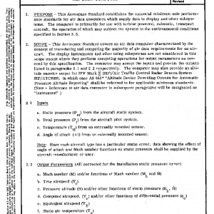 This Aerospace Standard covers an air data computer characterized by the concept of transducing and computing the majority of air data requirements for an aircraft. The display instruments and other using subsystems are not considered in this scope except where they perform computing operations for output parameters as covered by this specification. The computer may accept the inputs and provide the outputs listed in paragraphs 2.1 and 2.2 respectively. The computer may also provide an altitude encoder output for IFF Mark