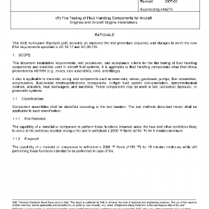 This document establishes requirements, test procedures, and acceptance criteria for the fire testing of fluid handling components and materials used in aircraft fluid systems. It is applicable to fluid handling components other than those prescribed by AS1055 (e.g., hoses, tube assemblies, coils, and fittings).