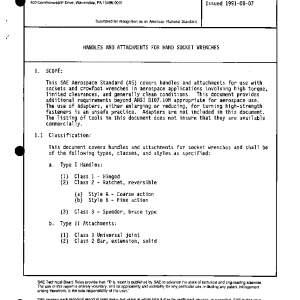 This SAE Aerospace Standard (AS) covers handles and attachments for use with sockets and crowfoot wrenches in aerospace applications involving high torque, limited clearances, and generally clean conditions. This document provides additional requirements beyond ANSI B107.10M appropriate for aerospace use. The use of adapters, either enlarging or reducing, for turning high-strength fasteners is an unsafe practice. Adapters are not included in this document. The listing of tools in this document does not insure that they are available commercially.