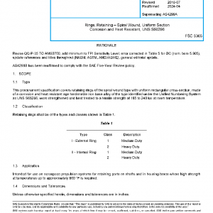 This procurement specification covers retaining rings of the spiral wound type with uniform rectangular cross-section, made of a corrosion and heat resistant age hardenable iron base alloy of the type identified under the Unified Numbering System as UNS S66286, work strengthened and heat treated to a tensile strength of 185 to 240 ksi at room temperature.