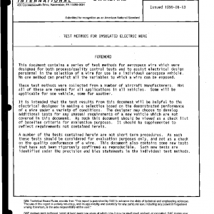 This standard describes test methods for insulated, single conductor, electric wire intended for aerospace applications. Particular requirements for the wire being tested need to be specified in a procurement document or other detail specification. Suggested minimum requirements are included in the notes at the end of some of the test methods. SAE Performance Standard AS4372 uses some of the tests in this document for evaluating comparative performance of aerospace wires.