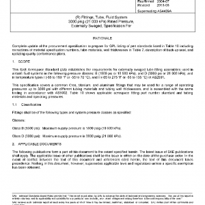 This SAE Aerospace Standard (AS) establishes the requirements for externally swaged tube-fitting assemblies used in aircraft fluid systems in the following pressure classes: B (1500 psi or 10 500 kPa), and D (3000 psi or 21 000 kPa), and in temperature types I (−65 to 160 °F or −55 to 70 °C), and II (−65 to 275 °F or −55 to 135 °C) of AS2001.