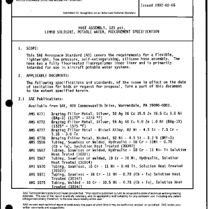 This SAE Aerospace Standard (AS) covers the requirements for a flexible, lightweight, low pressure, self-extinguishing, silicone hose assembly. The hose has a fully fluorinated fluoropolymer inner liner and is primarily intended for use in aircraft potable water systems.