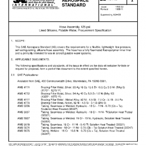 This SAE Aerospace Standard (AS) covers the requirements for a flexible, lightweight, low pressure, self-extinguishing, silicone hose assembly. The hose has a fully fluorinated fluoropolymer inner liner and is primarily intended for use in aircraft potable water systems.