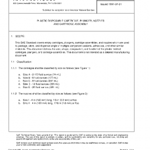 This SAE Standard covers empty cartridges, plungers, cartridge assemblies, and nozzles which are used to package, store, and dispense single or multiple component sealants, adhesives, and other similar materials. This document defines the size, shape, composition, and function of the plastic molded cartridges, plungers, and cartridge assemblies. This document is not intended as a detailed manufacturing document.
