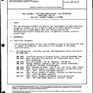 This SAE Aerospace Standard (AS) defines the requirements for heavy-duty hose assemblies suitable for use in 400 °F, 3000 psi aircraft hydraulic systems. Assemblies are suitable where rapid rate pressure pulsing and torsional/longitudinal flexing may occur, in addition to normal hydraulic system loads.