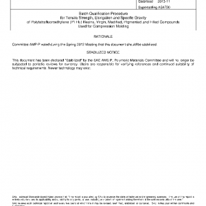 This SAE Aerospace Standard (AS) covers batch qualification procedure for virgin and compounded polytetrafluoroethylene (PTFE) resins used for compression molding. AS9100 requires virgin and modified PTFE as a testing material be representative of production PTFE and/or parts. The testing specified herein is limited to tensile strength, elongation and specific gravity. Any other tests required by the purchaser must be specified separately.