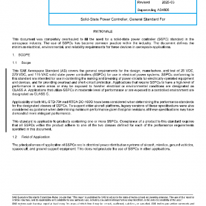 This SAE Aerospace Standard (AS) covers the general requirements for the design, manufacture, and test of 28 VDC, 270 VDC, and 115 VAC solid-state power controllers (SSPCs) for use in electrical power systems. SSPCs conforming to this standard are intended for use in controlling the making and breaking of power circuits for electrically operated equipment and devices, and for providing overload and short-circuit protection. Applications that require SSPCs to have a high level of performance in some areas or may be exposed to harsher electrical or environmental conditions are designated as CLASS A. Applications that utilize SSPCs in moderate level of performance or are exposed to a controlled environment are designated as CLASS C.