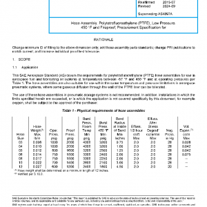 This SAE Aerospace Standard (AS) covers the requirements for polytetrafluoroethylene (PTFE) hose assemblies for use in aerospace fuel and lubricating oil systems at temperatures between -67 °F and 450 °F and at operating pressures per Table 1. The hose assemblies are also suitable for use within the same temperature and pressure limitations in aerospace pneumatic systems, where some gaseous diffusion through the wall of the PTFE liner can be tolerated.