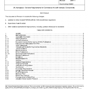 This SAE Aerospace Standard (AS) provides general requirements for components that are used in commercial aircraft hydraulic systems. It also includes the FAR/JAR/CS 25 regulations that apply to hydraulic components.
