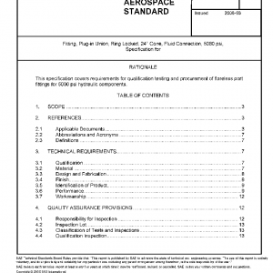 This SAE Aerospace Standard (AS) establishes the requirements for 24° cone AS5827 or EN 6123 flareless Ring locked fitting assemblies per AS5550 and AS5865, for use in aircraft fluid systems at nominal operating pressure of 5080 psi maximum and operating temperature range of -65 to +275 °F.