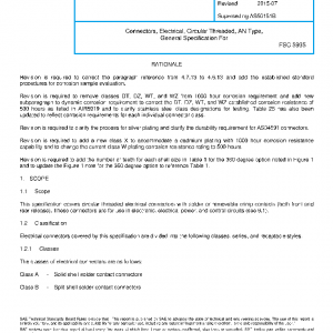 This specification covers circular threaded electrical connectors with solder or removable crimp contacts (both front and rear release). These connectors are for use in electronic, electrical power, and control circuits (see 6.1).