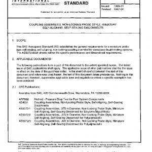 This SAE Aerospace Standard (AS) establishes the general requirements for a miniature probe type self-sealing, self-aligning, non-locking coupling intended for aerospace liquid cooling systems. The AS5072/slash sheets define the specific performance and dimensional requirements.