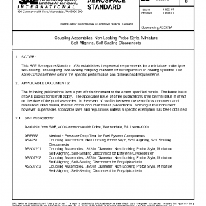 This SAE Aerospace Standard (AS) establishes the general requirements for a miniature probe type self-sealing, self-aligning, non-locking coupling intended for aerospace liquid cooling systems. The AS5072/slash sheets define the specific performance and dimensional requirements.