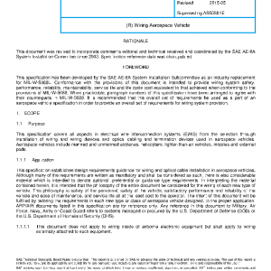 This specification covers all aspects in electrical wire interconnection systems (EWIS) from the selection through installation of wiring and wiring devices and optical cabling and termination devices used in aerospace vehicles. Aerospace vehicles include manned and unmanned airplanes, helicopters, lighter-than-air vehicles, missiles and external pods.
