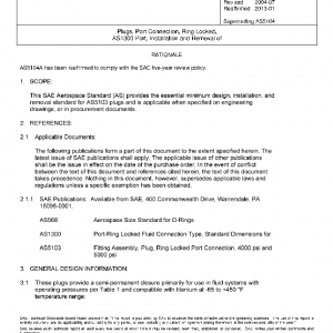This SAE Aerospace Standard (AS) provides the essential minimum design, installation, and removal standard for AS5103 plugs and is applicable when specified on engineering drawing, or in procurement documents.
