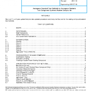 This SAE Aerospace Standard (AS) describes test methods to determine the application and performance properties of two-component sealing compounds. It shall be used in conjunction with AS5127 and the applicable material specification. When modifications to these test methods are called out in material specifications, the material specification shall take precedence.