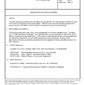 This SAE Aerospace Standard (AS) describes the characteristics of a desiccant port installed through the flat wall of a shipping and storage container. With the cover removed, the desiccant port shall provide access to the interior of the container for installation and removal of desiccant.