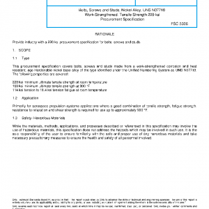 This procurement specification covers bolts, screws and studs made from a work-strengthened corrosion and heat resistant, age Hardenable nickel base alloy of the type identified under the Unified Numbering System as UNS N07718. The following properties are covered: