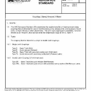 This SAE Aerospace Standard (AS) establishes the requirements for a V-band grooved clamp couplings that are intended for use on fluid-line tubing joints, tailpipe joints, and accessory mount joints, on flight vehicles or other attachments. The semi-rigid coupling joint assemblies, hereafter referred to as “the joint”, shall operate within the temperature range of −65 to +1200 °F.