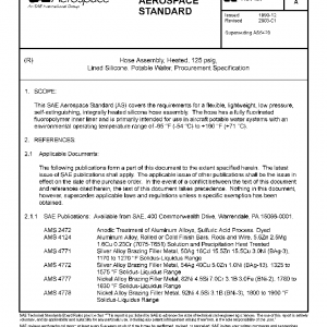 This SAE Aerospace Standard (AS) covers the requirements for a flexible, lightweight, low pressure, self-extinguishing, integrally heated silicone hose assembly. The hose has a fully fluorinated fluoropolymer inner liner and is primarily intended for use in aircraft potable water systems with an environmental operating temperature range of -65 °F (-54 °C) to +160 °F (+71 °C).
