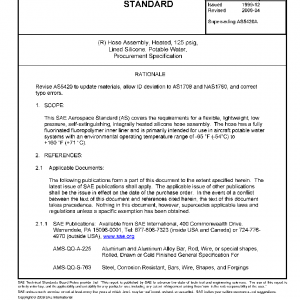 This SAE Aerospace Standard (AS) covers the requirements for a flexible, lightweight, low pressure, self-extinguishing, integrally heated silicone hose assembly. The hose has a fully fluorinated fluoropolymer inner liner and is primarily intended for use in aircraft potable water systems with an environmental operating temperature range of -65 °F (-54°C) to +160 °F (+71 °C).