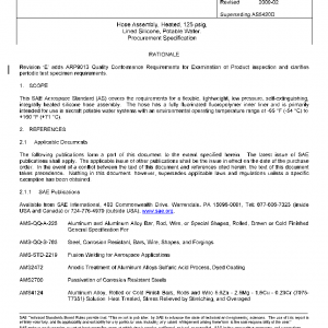 This SAE Aerospace Standard (AS) covers the requirements for a flexible, lightweight, low pressure, self-extinguishing, integrally heated silicone hose assembly. The hose has a fully fluorinated fluoropolymer inner liner and is primarily intended for use in aircraft potable water systems with an environmental operating temperature range of −65 °F (−54 °C) to +160 °F (+71 °C).
