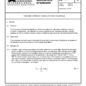 This Aerospace Standard establishes a uniform procedure for calculation of electron vacancy numbers in superalloys. It is intended for use by suppliers of raw materials and parts, typically castings, for which control of electron vacancy number is required by the raw material specification.