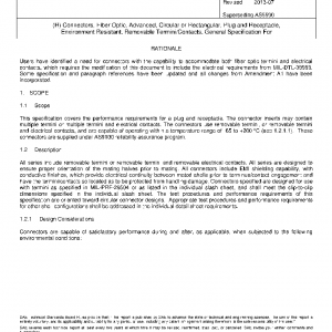 This specification covers the performance requirements for a plug and receptacle. The connector inserts may contain multiple termini or multiple termini and electrical contacts. The connectors use removable termini, or removable termini and electrical contacts, and are capable of operating within a temperature range of −65 to +200 °C (see 1.2.1.1). These connectors are supplied under AS9100 reliability assurance program.