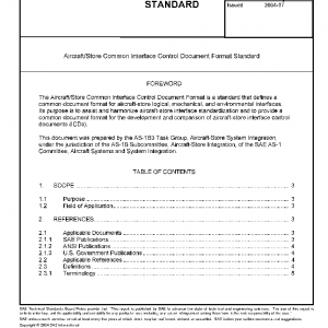 This SAE Aerospace Standard (AS) defines the editorial format and policies necessary for the publication of Interface Control documents. The Common Interface Control Document Format Standard defines a common format for aircraft/store interface documents to foster increased interoperability. It is designed with the versatility to serve differing “ICD” philosophies and organizations.