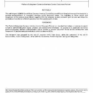 This SAE Aerospace Standard (AS) defines the editorial format and policies necessary for the publication of platform/subsystem Interface Control documents. The Common Interface Control Document Format Standard defines a common format for platform to subsystem interface documents to facilitate subsystem integration.