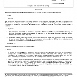 This Aerospace Standard specifies the inside diameters, cross-sections, tolerances, and size identification codes (dash numbers) for O-rings used in sealing applications and for straight thread tube fitting boss gaskets. The dimensions and tolerances specified in this standard are suitable for any elastomeric material provided that suitable tooling is available.