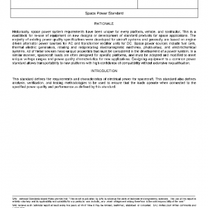 This standard defines the requirements and characteristics of electrical power for spacecraft. This standard also defines analysis, verification, and testing methodologies to be used to ensure that the loads operate when connected to the specified power quality and performance as defined by this standard.