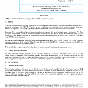 This SAE Aerospace Standard (AS) covers solid, uncut polytetrafluoroethylene (PTFE) retainers (backup rings) for use in glands in accordance with AS4716. They are for use in hydraulic and pneumatic system components as anti-extrusion devices in conjunction with O-rings, packings and other elastomeric seals for static and dynamic applications.