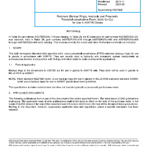 This SAE Aerospace Standard (AS) specifies solid, un-cut polytetrafluoroethylene (PTFE) retainers (backup rings) for use in glands in accordance with AS4716. They are usually used in hydraulic and pneumatic system components as anti-extrusion devices in conjunction with O-rings and other seals for static and dynamic applications.