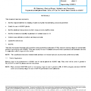 This SAE Aerospace Standard (AS) specifies solid polytetrafluoroethylene (PTFE) retainers (backup rings) for use in static glands in accordance with AS5857. They are usually for use in hydraulic and pneumatic systems as anti-extrusion devices in conjunction with O-rings and other seals.