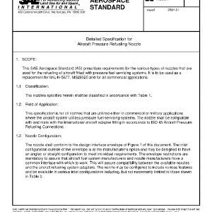 This SAE Aerospace Standard (AS) prescribes requirements for the various types of nozzles that are used for the refueling of aircraft fitted with pressure fuel servicing systems. It is to be used as a replacement for MIL-N-5877, MS29520 and for all commercial applications.