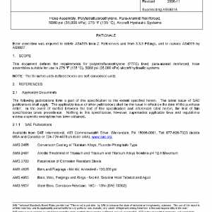This document defines the requirements for polytetrafluoroethylene (PTFE) lined, para-aramid reinforced, hose assemblies suitable for use in 275 °F (135 °C), 5080 psi (35,000 kPa) aircraft hydraulic systems.