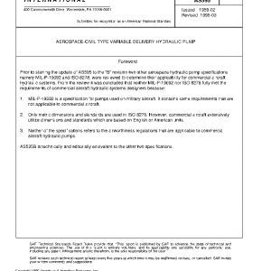 This SAE Aerospace Standard (AS) establishes the general requirements for pressure compensated, variable delivery hydraulic pumps, suitable for use in commercial aircraft hydraulic systems.