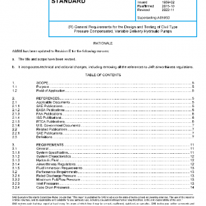 This SAE Aerospace Standard (AS) provides general design and test requirements for a flat cut-off pressure compensated, variable delivery hydraulic pump for use in a civil aircraft hydraulic system with a rated system pressure up to 5000 psi (34500 kPa).