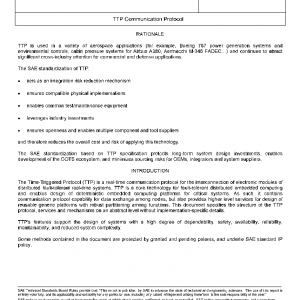 This SAE Aerospace Standard (AS) establishes the specification for TTP communication protocol functionality as a core networking component for design of synchronous, time-triggered distributed real-time communication networks.