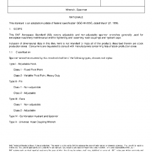 This SAE Aerospace Standard (AS) covers adjustable and non-adjustable spanner wrenches generally used for aerospace machinery maintenance and for tightening and loosening hose couplings and hydrant caps.