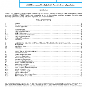 This SAE Aerospace Standard (AS) defines the items that shall be considered when creating a fiber optic cable assembly specification and source control drawing intended for installation on aerospace platforms.