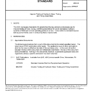 This SAE Aerospace Standard (AS) establishes the requirements and procedures for impulse testing of hose, tubing, and fitting assemblies for use in aerospace hydraulic systems of 8000 psi nominal operating pressure or less. It also refers to standard impulse test equipment to be used in conducting these impulse tests.